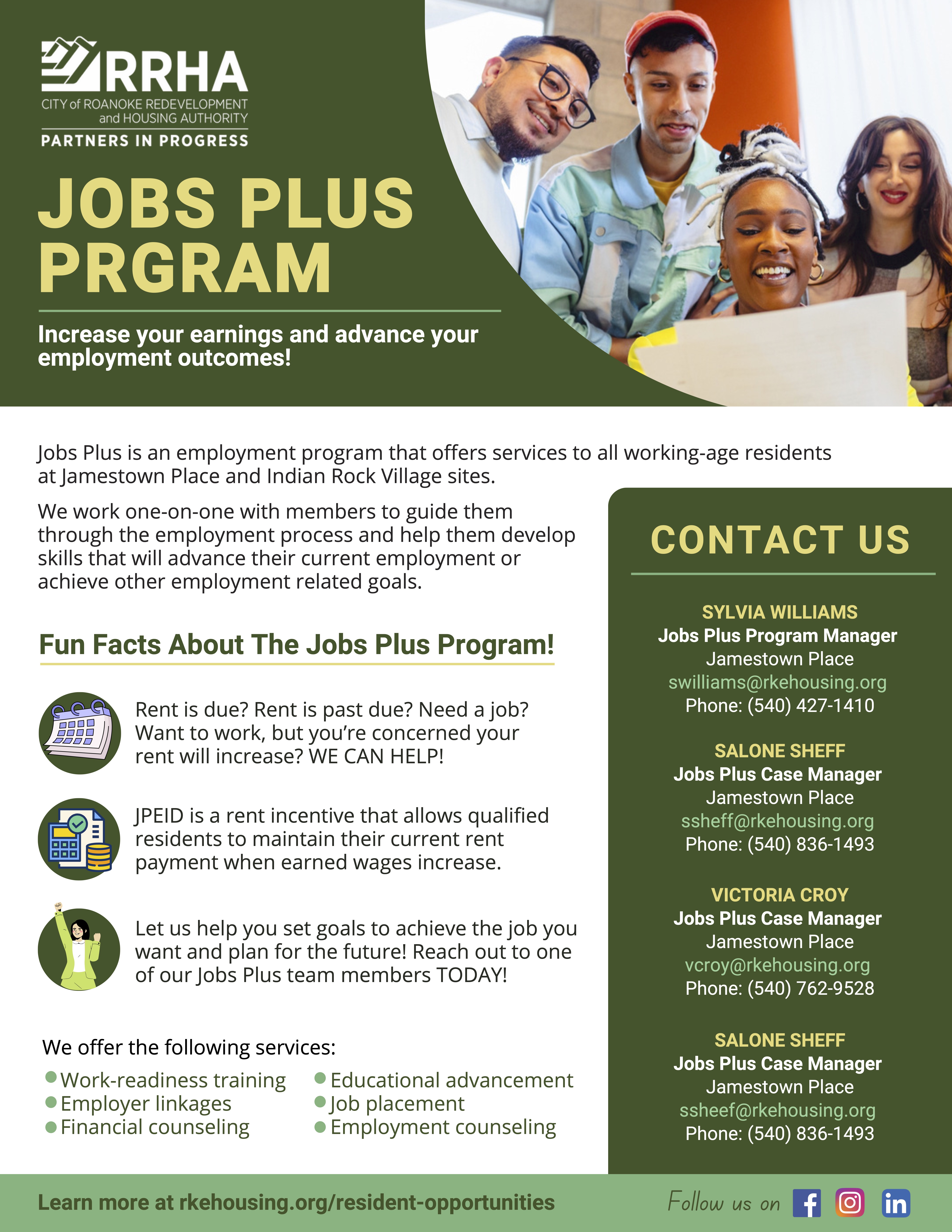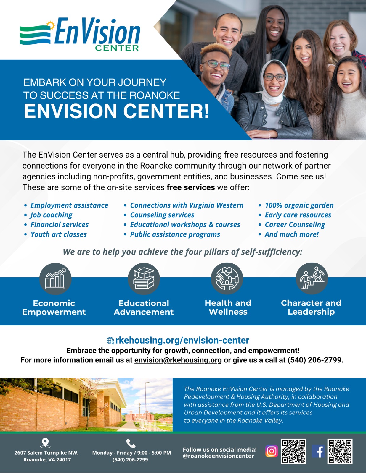Below are examples of flyers created for RRHA’s EnVision Center, a central hub that provides free resources and strengthens community connections through a network of partner agencies, to promote the various services and events it offers to the Roanoke community.